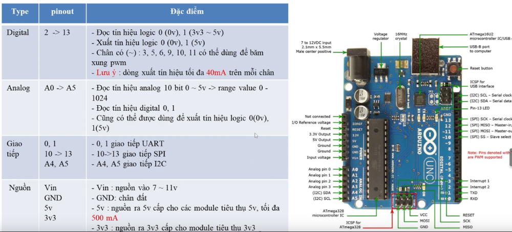 Arduino Uno là một bo mạch vi điều khiển (microcontroller board) dùng để lập trình nhúng (embedded controller). Nó sử dụng sử dụng chip ATmega328P được dùng để học lập trình điều khiển thiết bị điện tử và tạo các dự án IoT, robot, tự động hóa…