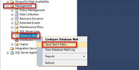 -Vào thư mục Management sau đó chọn Database Mail rồi click chuột phải chọn Send Test E-mail…